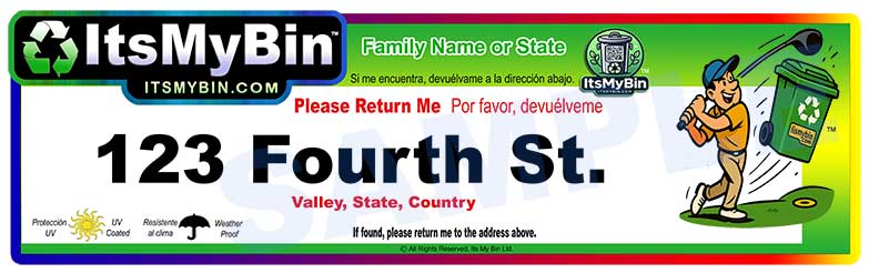 Weatherproof bin label printed with your address — no handwriting needed. Ready to apply and built to last.